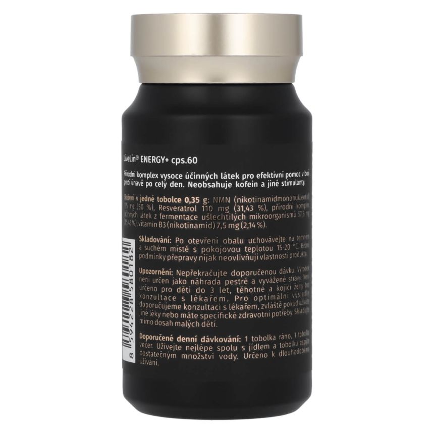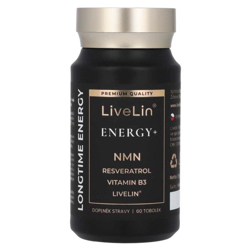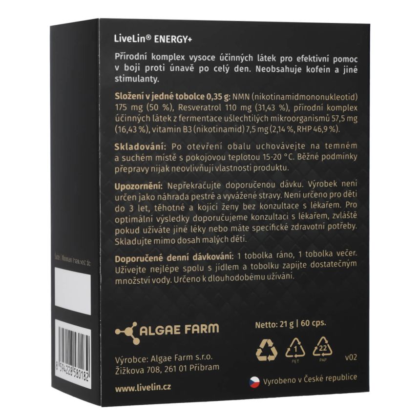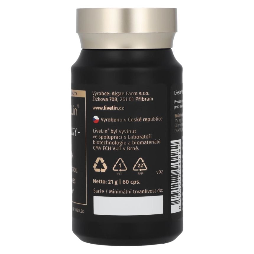 Doplněk stravy LiveLin® Energy+ je čistě přírodní komplex účinných látek podporujících správnou činnost nervového systému, kognitivních funkcí mozku a energetického metabolismu. Obsahuje unikátní mikronizovanou biomasu LiveLin®, vyrobenou biotechnologickým fermentačním procesem, při němž se využívají ušlechtilé mikroorganismy k produkci účinných látek nezbytných pro imunitu a trvalé zdraví. Je uložen v enterosolventní tobolce, která chrání před degradací látek žaludeční kyselinou a zajišťuje vstřebatelnost účinných látek v tenkém střevě. Neobsahuje kofein a jiné stimulanty, přídatné látky, barviva, ochucovadla ani stabilizátory.