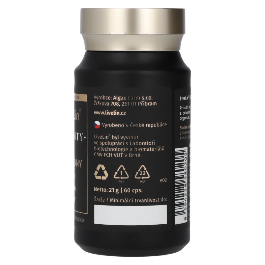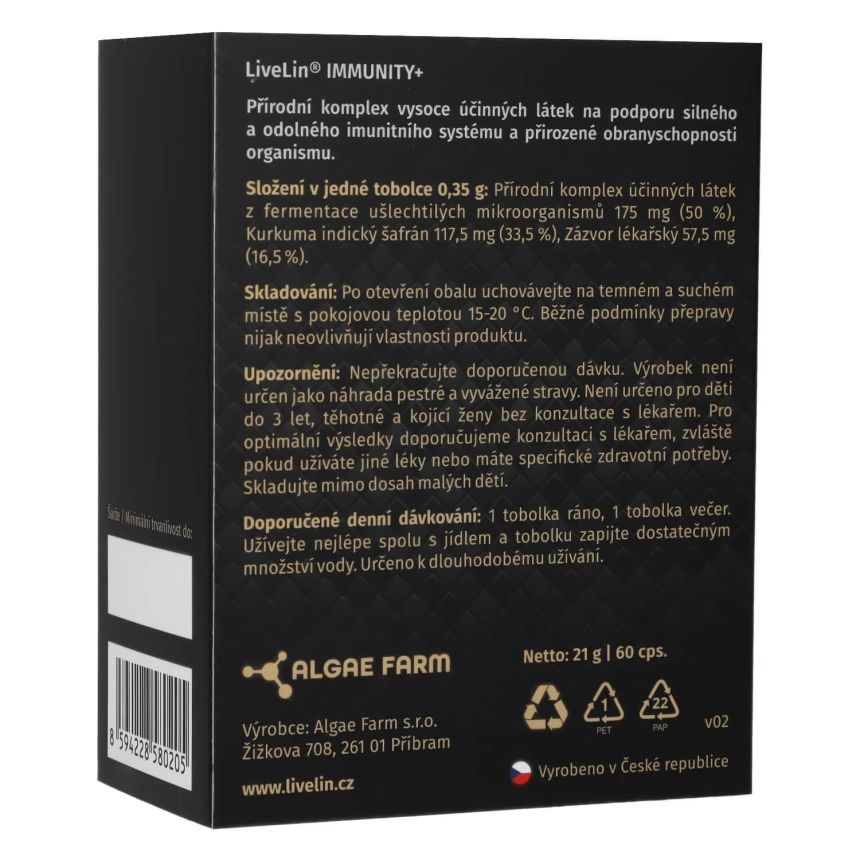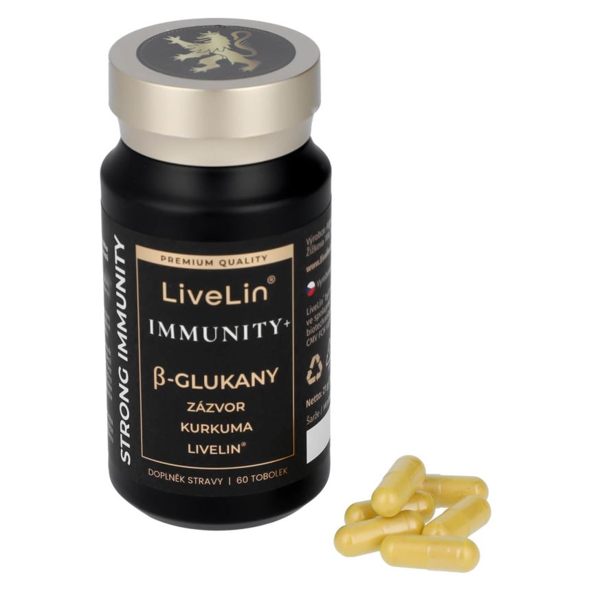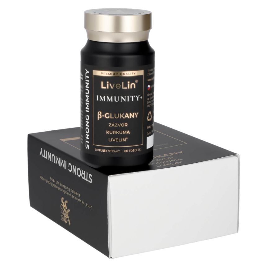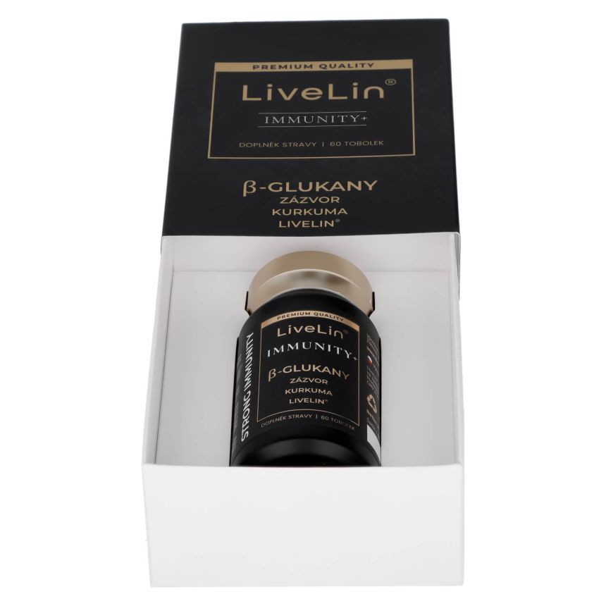 Doplněk stravy LiveLin® Immunity+ je čistě přírodní komplex betaglukanů, extraktu z Kurkumy, Zázvoru lékařského a unikátní mikronizované biomasy, vyrobené biotechnologickým fermentačním procesem, při němž se využívají ušlechtilé mikroorganismy k produkci účinných látek nezbytných pro imunitu a trvalé zdraví. Produkt neobsahuje žádné přídatné látky, barviva, ochucovadla ani stabilizátory.