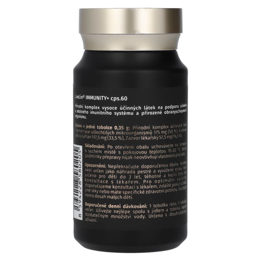 LiveLin® Immunity+ je komplex vysoce účinných látek s vysokou vstřebatelností se synergickým efektem jednotlivých složek. Směs je uložena v enterosolventní tobolce pro dokonalou ochranu před biodegradací účinných látek žaludeční kyselinou. Obsahuje nejsilnější přírodní imunostimulanty, antioxidanty, protizánětlivé látky a další složky podporující trvalé zdraví a odolnost vůči nemocem. Na rozdíl od synteticky vyrobených produktů na podporu imunity, často bez významného účinku na zdraví.