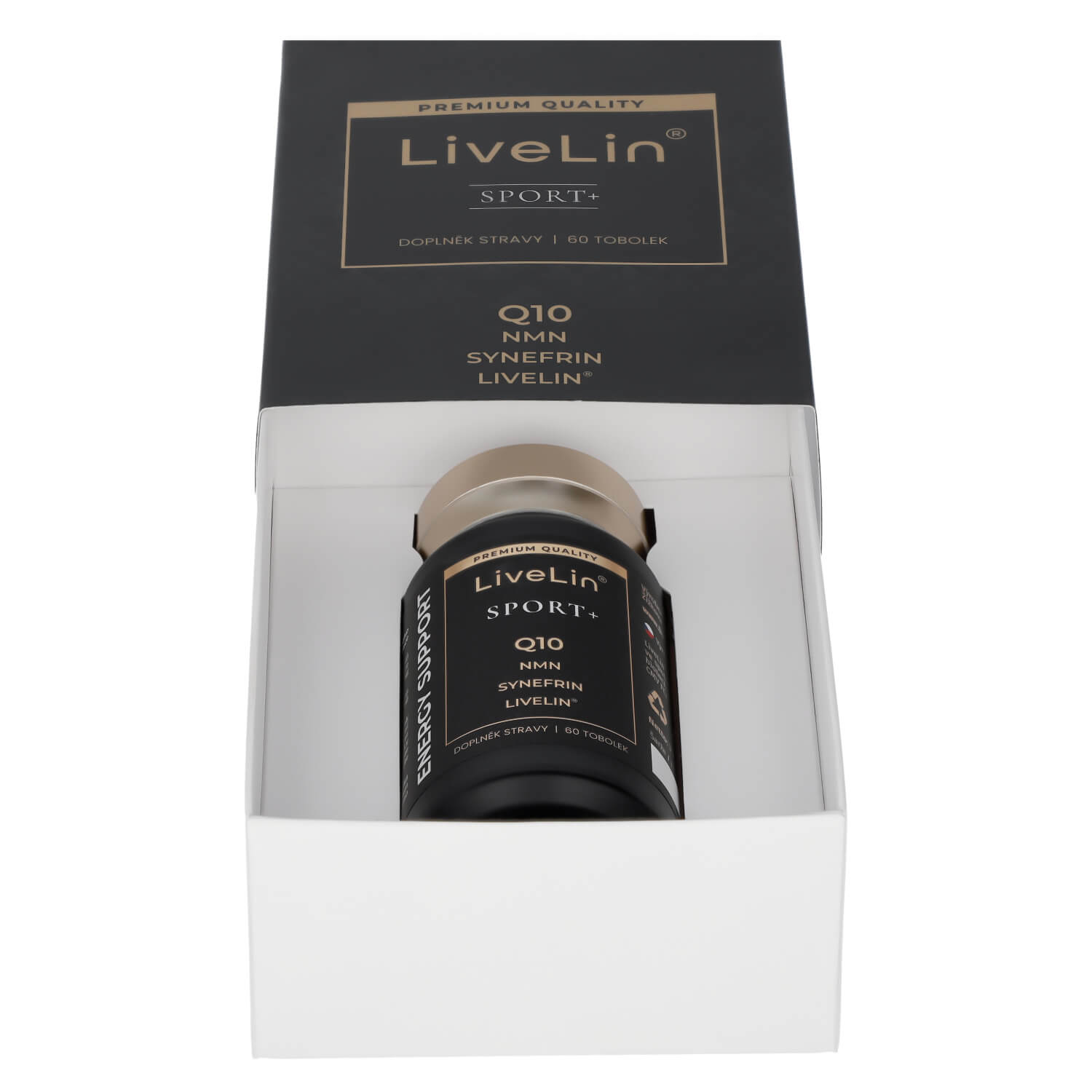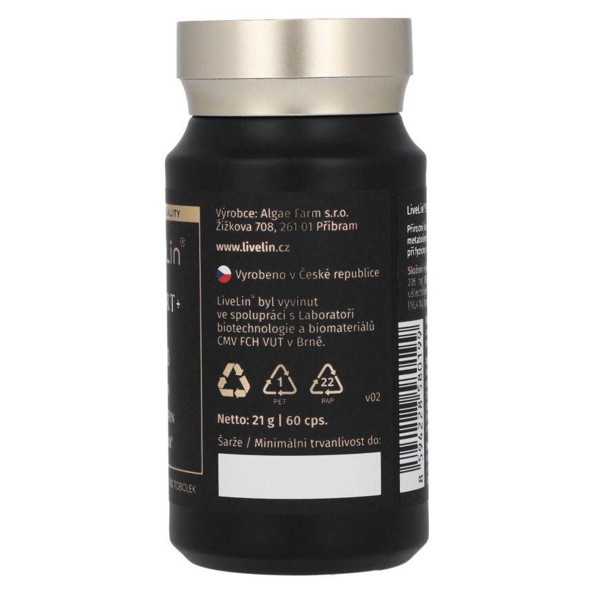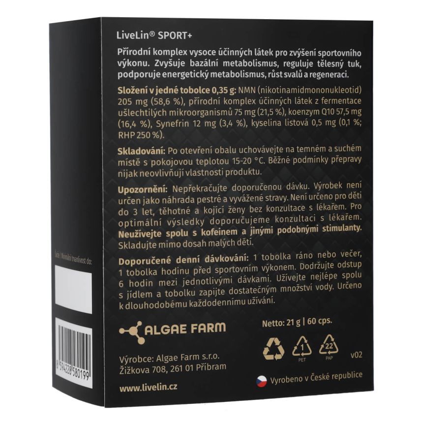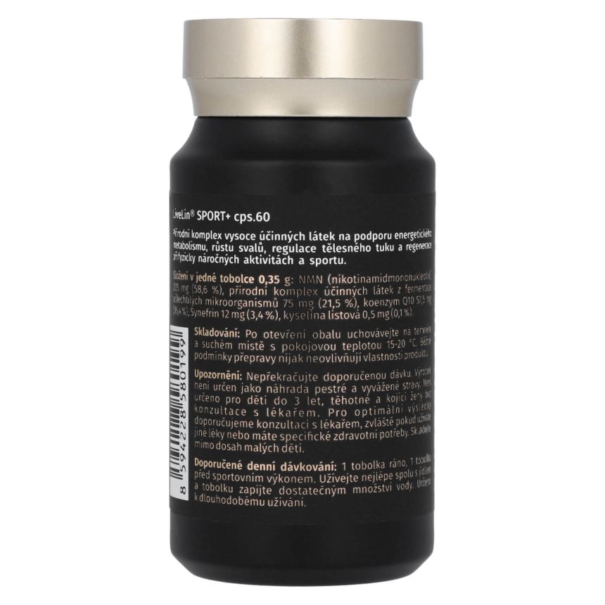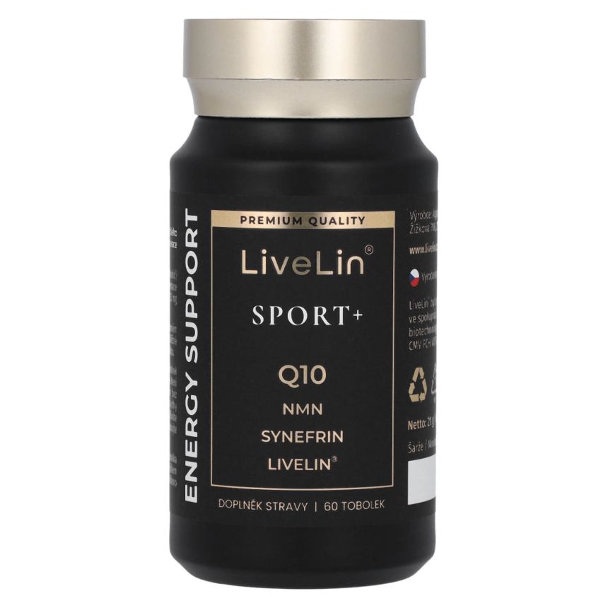 LiveLin® Sport+ je prémiový doplněk stravy v kapslích, vyvinutý pro aktivní jedince a sportovce, kteří chtějí posunout své hranice výkonnosti organismu a regenerace. Kombinace nejmodernějších zcela přírodních látek podporujících energetický metabolismus, vitalitu a fyzickou odolnost. Obsahuje LiveLin® unikátní mikronizovanou biomasu, vyrobenou biotechnologickým fermentačním procesem, při němž se využívají ušlechtilé mikroorganismy k produkci účinných látek nezbytných pro trvalé zdraví a dlouhověkost. Produkt neobsahuje žádné přídatné látky, barviva, ochucovadla ani stabilizátory.